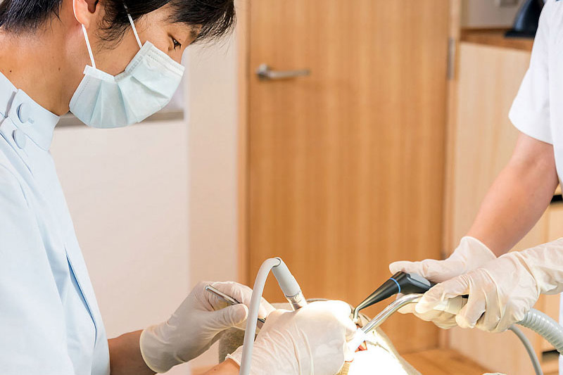 検査器具、レントゲン(CT含む)にて口腔内の状態を調べます。虫歯、歯周病などあれば、その治療も行います。